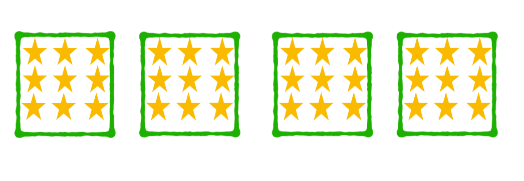 Or with Arrays, by drawing 4 boxes and adding a shape to each one until reaching 36 (9 stars in each box)