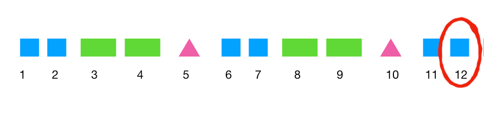 If you extend the pattern, you can see that a blue square is the 12th figure.