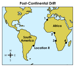 Which location on the continent of Africa would have once corresponded to Location R on South America before the landmass Pangaea broke apart?