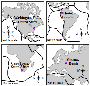The map shows four cities and tectonic plate boundaries found in different parts of the world.