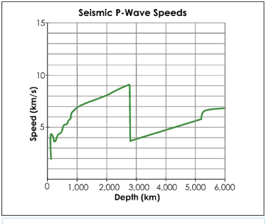 Why does the speed of the P-wave drop so drastically in this graph at 2800km of depth?