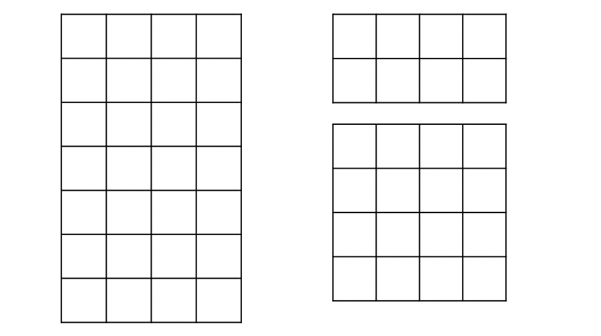 Ezra says the rectangle on the left has the same area as the sum of the two on the right. Eric says they do not have the same areas. Who is correct? Explain using numbers, pictures, and words.