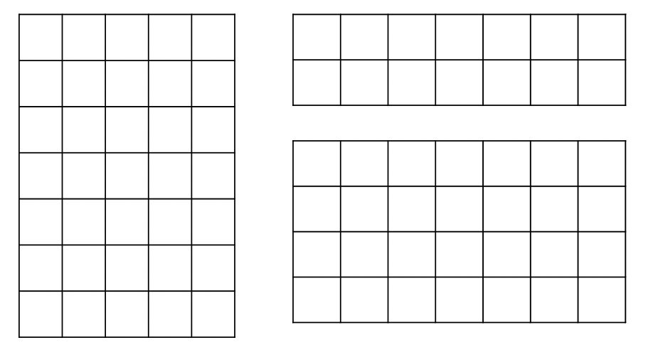 Lena says the rectangle on the left has the same area as the sum of the two on the right. Eduardo says they do not have the same areas. Who is correct? Explain using numbers, pictures, and words.