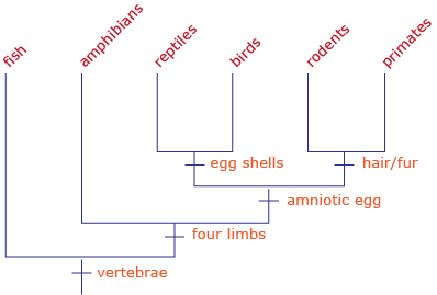 Based on the cladogram, which characteristic represents the commonality between fish and primates?