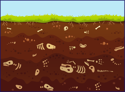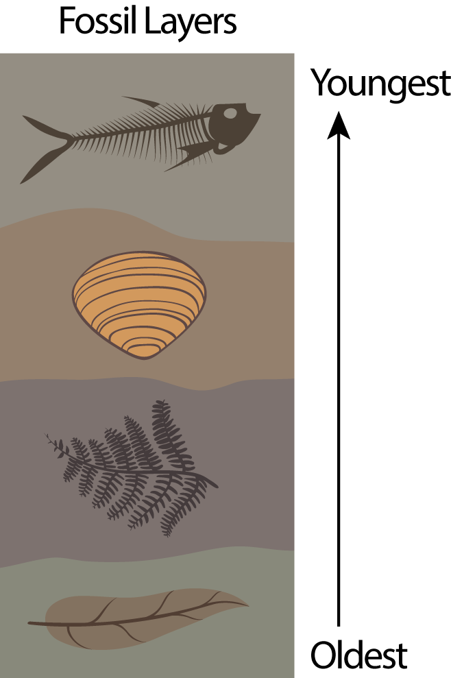 Weathering and erosion occurred on a stream bank and exposed rock layers containing fossils. The fossils were found in the following order from bottom to top:
