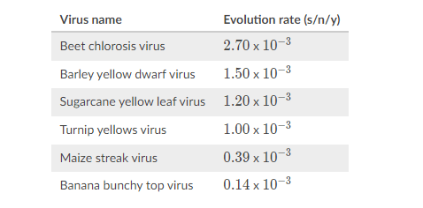 The following table lists evolution rate estimates for a set of plant viruses. The evolution rates are measured as the number of base-pair substitutions per nucleotide site in the virus genome, per year (s/n/y). Which statement is true based on the table?
