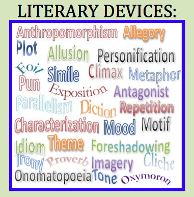 What is metaphor, simile, repetition, dialogue, imagery, alliteration, understatement, onomatopoeia, symbolism, personification, motif, etc