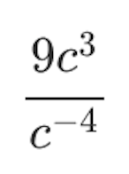 Move only the c-4 up as a positive reciprocal (c4). Add the exponents c3 + 4 to get 9c7.