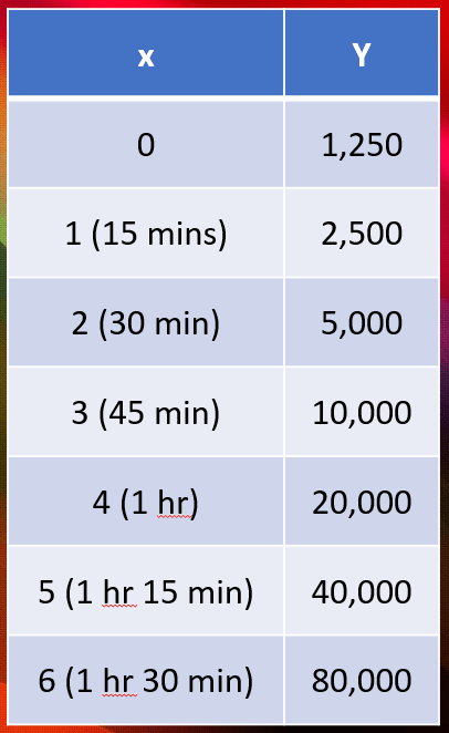 A bacteria culture doubles every 0.25 hours. At time 1.25 hours, there are 40 000 bacteria present. How many bacteria were present initially?