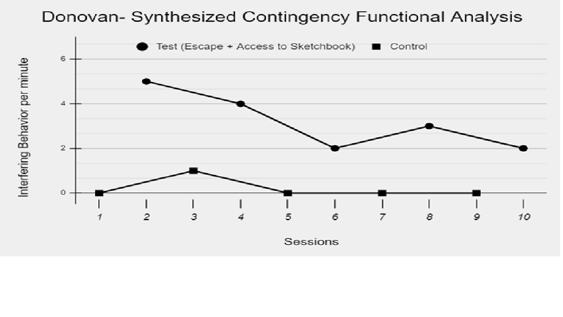 Ms. Bailey graphs and visually analyzes the data on Donovan’s problem behavior during the FA. She notices that the problem behavior occurred only one time during the control condition, meaning that the condition likely met Donovan’s needs, making problem behavior unnecessary. Ms. Bailey also sees clear differentiation between the control and test (demand + access to tangible) conditions. Overall, the pattern of responding from Donovan suggests to Ms. Bailey that Donovan’s behavior is maintained by escape from reading tasks to access his sketchbook.