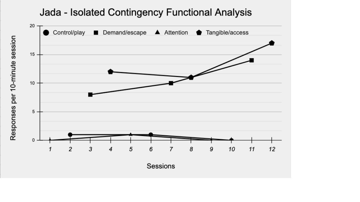 Dr. Brown-Davis graphs and visually analyzes the data on Jada’s problem behavior during the FA. He notices that the problem behavior did not occur during the play/control conditions. This suggests that the condition adequately met Jada’s needs, making problem behavior unnecessary from her point of view. Dr. Brown-Davis also sees clear differentiation between the play/control and the demand/escape conditions, and between the play/control and tangible/access conditions. He notices that low rates of problem behavior occurred during the attention condition. Overall, the pattern of responding from Jada suggests to Dr. Brown-Davis that her behavior is not maintained by automatic reinforcement. (If it were, the behavior would likely have occurred across all conditions without clear differentiation).