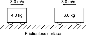 The diagram below shows a 4.0-kilogram cart moving to the right and a 6.0-kilogram cart moving to the left on a horizontal, frictionless surface.