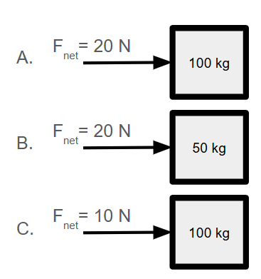 All objects are pushed for 2 seconds. Which two experience the same impulse?