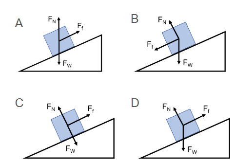Which FBD is correct for an object at rest on an inclined plane?