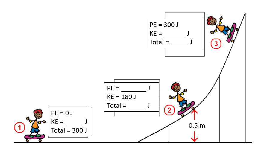An skateboarder starts with 400 J of PE and rolls down a rough ramp with a lot of friction. Would their kinetic energy at the bottom of the ramp be greater than, less than, or equal to 400 J?