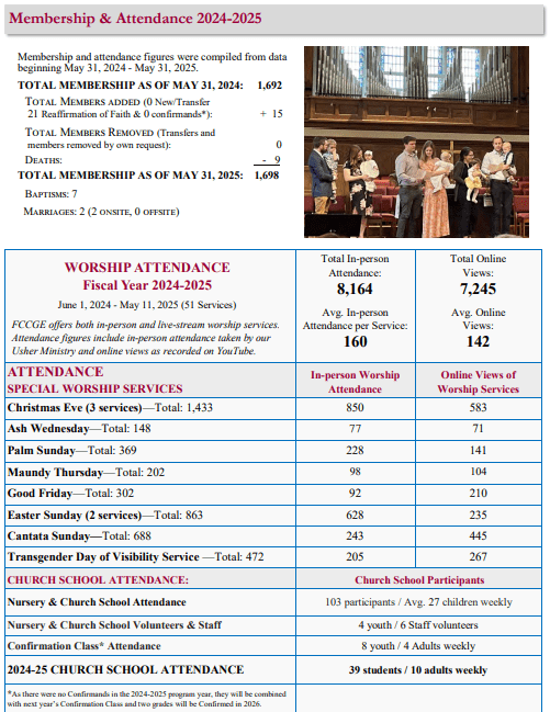 This contained the names of every person who has ever been a member of FCCGE. It was orginally made by Kay Wahlgren for out 125th anniversary and is updated by Sharon Wussow. (page 89)