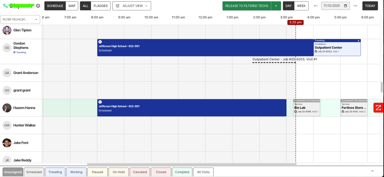 The value of the dispatch board is allow service managers to get an overhead view of their technicians, what projecst they are on, and even get live statuses of where they are at.