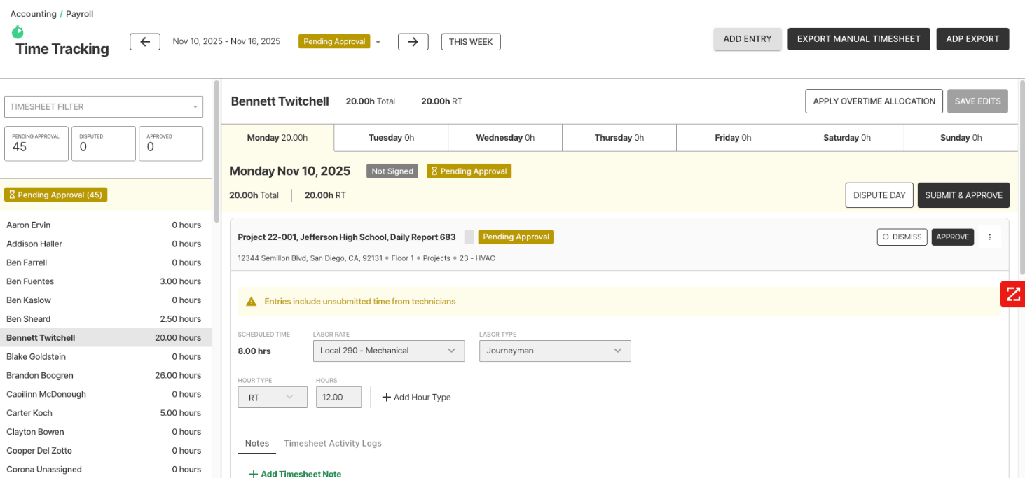Time tracking in BuildOps helps contractors improve job costing accuracy, optimize labor efficiency, and streamline payroll by capturing real-time hours directly from the field.
