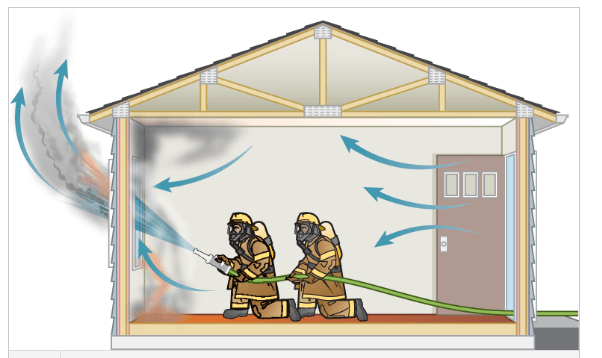 The use of positive pressure fans to control the flow of products of combustion while fire suppression efforts are underway.