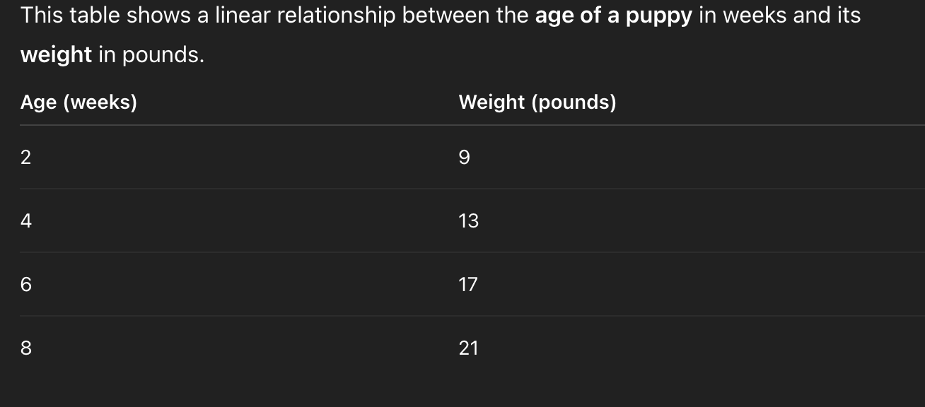 ❏ C. The puppy’s weight increases at a constant rate of 4 lb per week.