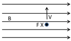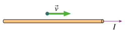 An electron is moving near a long, current-carrying wire, as shown in the figure below. What is the direction of the magnetic force on the electron?