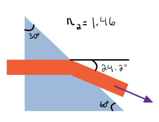 The figure shows a laser beam deflected by a 30-60-90 prism. The index of refraction outside the prism is n=1.46. What is the prisms index of refraction?