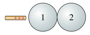 Metal spheres 1 and 2 are touching. Both are initially neutral. The charged rod is brought near before the spheres are separated. After the separation, the charged rod is removed. Are the charges on the spheres positive, negative, or zero?