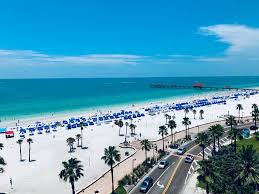 Which beach, located west of Tampa, is known for dolphin sightings and a long beachfront pier perfect for sunsets?