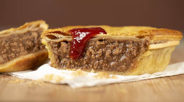 In Australia and New Zealand, a meat pie is a hand-sized pie containing diced or minced meat and gravy, sometimes with onion, mushrooms, or cheese and often consumed as a takeaway food snack