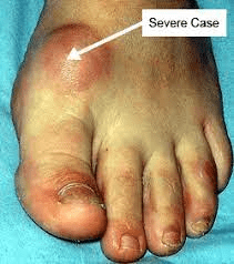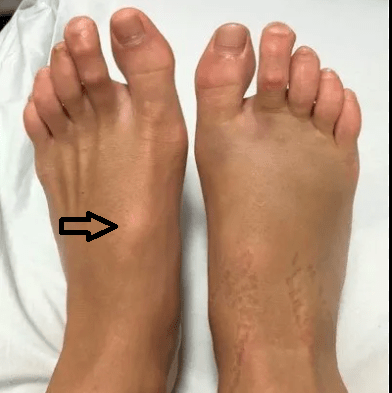 Tenderness, swelling, and enlargement of joint of the 1st Metatarsophalangeal joint. As inflammation continues, angulation increases causing painful ambulation. Tendinitis in great toe flexors may develop. Looking for the medical term and there are two words in the name.