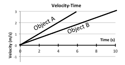 If both objects have the same mass, then Object A was pushed by a greater force. When we changed the strength of the fan force pushing two identical carts, the cart with the strongest fan force increased its velocity at a greater rate (had a greater acceleration). Its velocity-time graph had a steeper slope than the cart being pushed by the weaker fan. In the velocity-time graph shown, Object A has the steeper line, so it is being pushed by a greater force than Object B.
