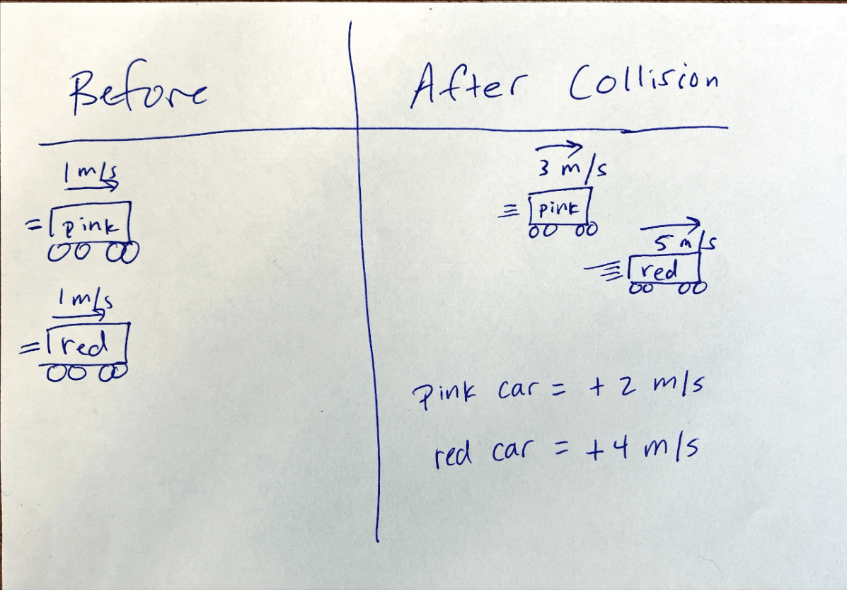 Two same sized hot wheels cars (one red, one pink) are rolling along at the same speed (1 m/s). Each small car is bumped by a large toy car. The red hot wheel car is now going 5 m/s after the bump. The pink hot wheel car is now going 3 m/s after the bump.