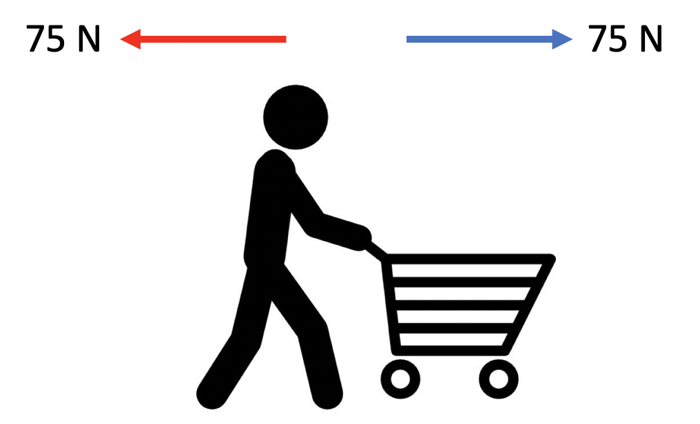 The grocery cart would not be moving because the forces are equal (balanced), which means the person's push is not larger than the force of friction.