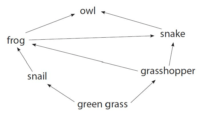 In the food web below, if the frog population suddenly increased, which organisms would be most likely to decrease right away?
