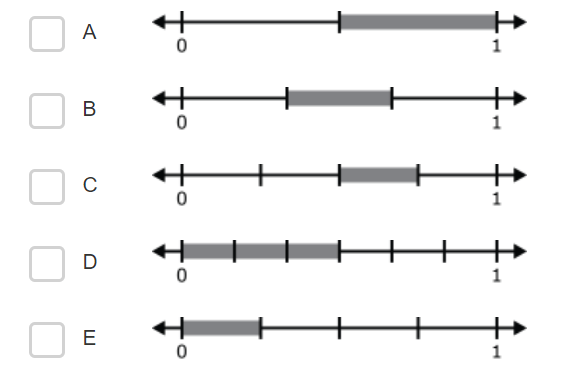 Which number lines show the fraction 1/2 as a shaded segment? Select ALL that apply.
