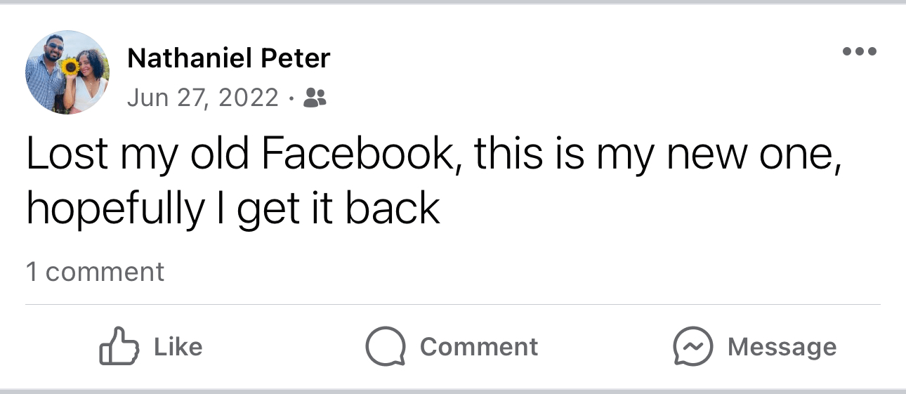 "Lost my old Facebook, this is my new one, hopefully I get it back"