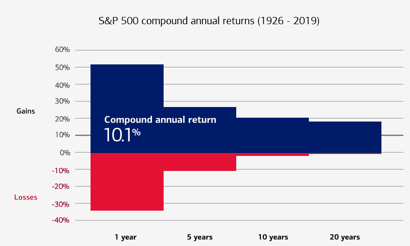What is holding stocks over a one-year period has led to a wide range of both positive and negative returns. However, holding them for any 20-year period between 1926 and 2019 has generated a much narrower range of outcomes.