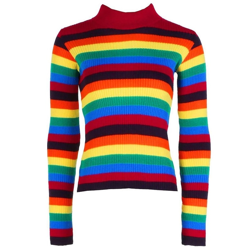 This sweater has red, black, yellow, green, blue, and orange stripes.