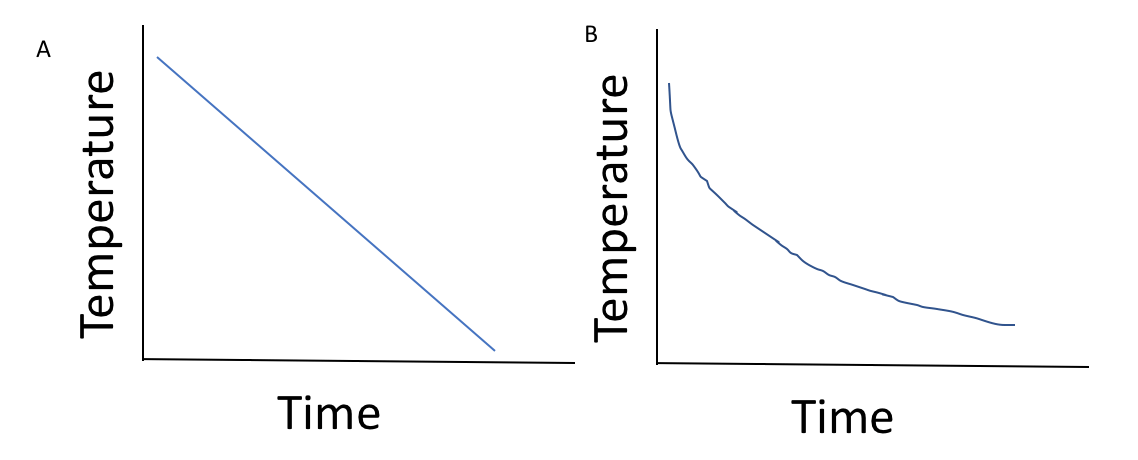 A cup of hot chocolate's temperature decreases at a constant rate. Which graph best represents this situation?