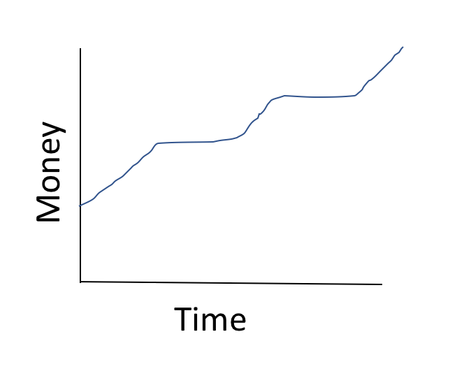 It tells us we start with some money already and the amount increases, then stays the same, then increases again, then stays the same again, and then increases more over time.