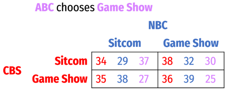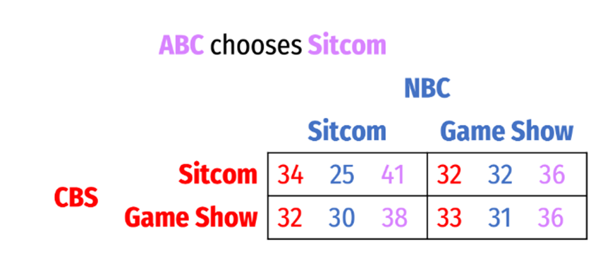 (Game Show, Game Show, Sitcom) or (33, 31, 36) - I'll accept either.