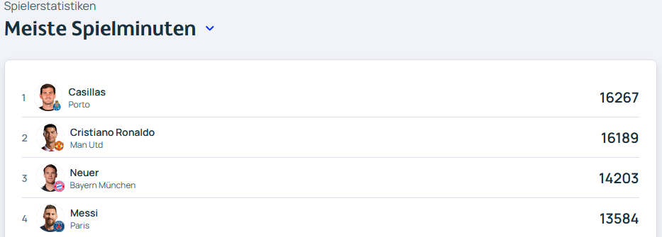Welcher dieser Spieler hat die meisten Spielminuten in der Champions League?