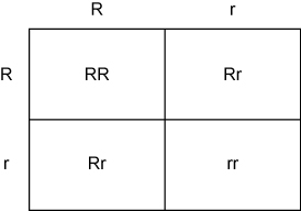 The diagram below is of a Punnett square for the cross between two heterozygous flowers, Rr and Rr.