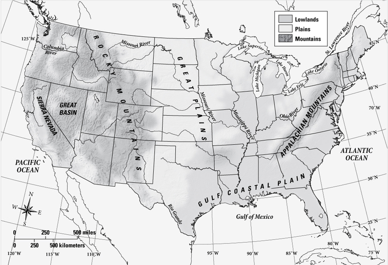 Which land feature of the United States is northeast of the Gulf Coastal Plains?