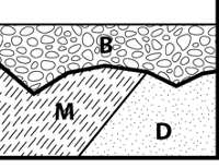 There is an irregularly shaped line between layer B and layers M and D. Which came first, that line or layer D?
