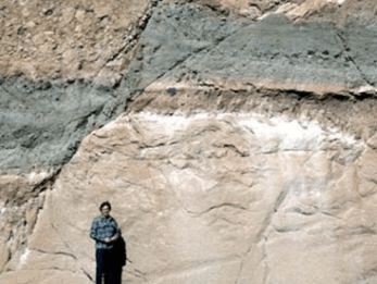 The lighter layer behind the geologist came first because of the Law of SUPERPOSITION