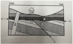 The intrusion (letter F in the diagram) is the youngest event if it cuts across all layers.