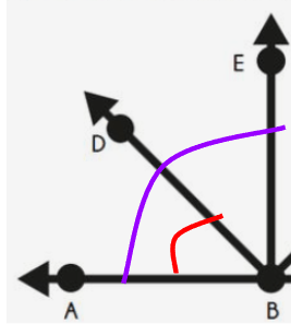 If angle ABE represented by the purple line is 90 degrees and angle ABD represented by the red line is 45 degrees, what is the measurment of the remaining angle?
