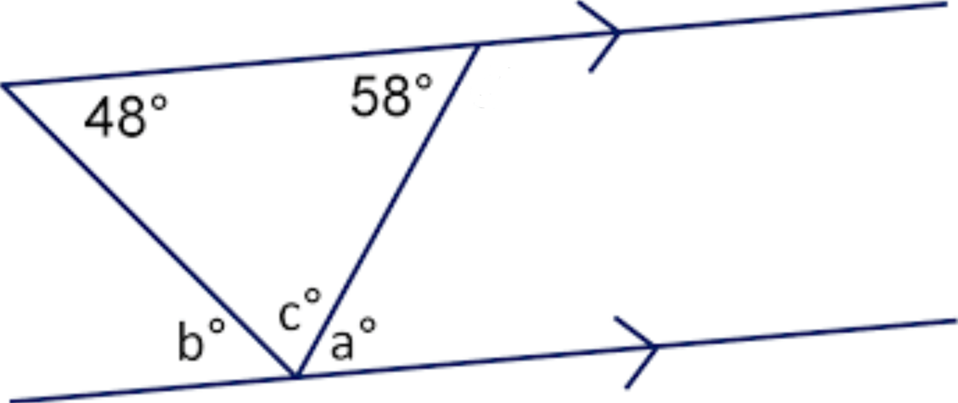 FInd the measures of a, b, and c in the figure below (hint: the lines are parallel)