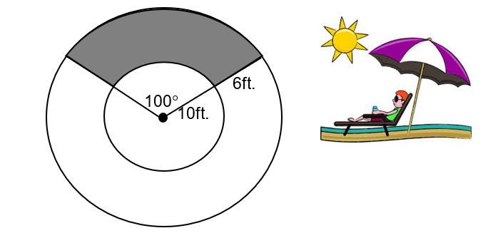 Find the area of the shaded sector in terms of pi. The radius of the pool is 10 ft, and the concrete portion will be a 6 ft wide partial ring